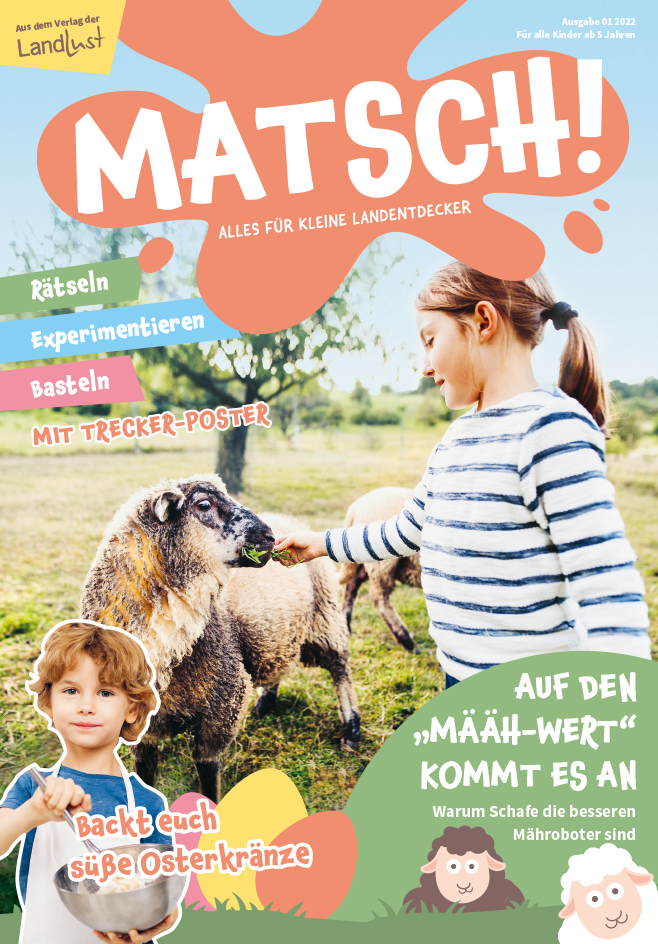 Diese Woche ist es endlich soweit: Die erste Ausgabe von MATSCH!, dem neuen Kindermagazin aus der Wochenblatt-Familie des Landwirtschaftsverlages Münster, erscheint. Auf 44 Seiten dreht sich alles um die Themen Umwelt, Natur, Wald, Landwirtschaft sowie Ernährung. Dabei gibt es einen Mix aus Geschichten zum Lesen oder Vorlesen, jede Menge Rätsel und Experimente sowie zahlreiche Anleitungen zum Selbermachen.